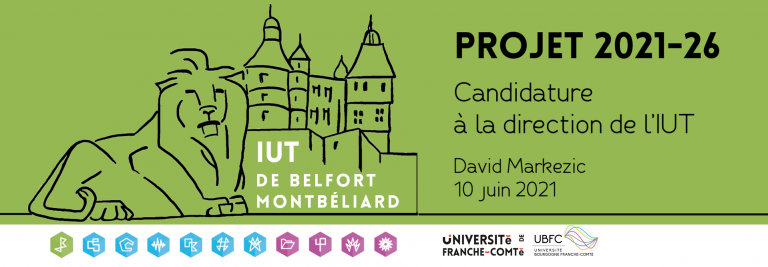 Ce site est destiné à tous les membres de la communauté de l’IUT de Belfort Montbéliard. Il vous est ainsi possible de prendre connaissance du projet porté par David Markezic et sa colistière Valérie Lepiller.